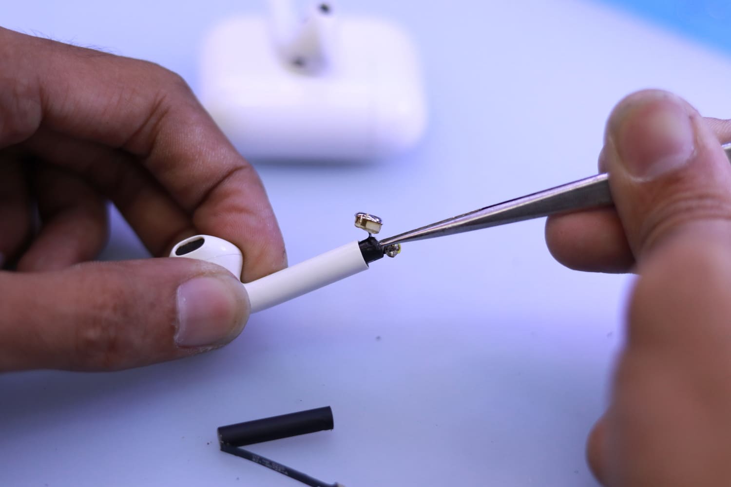 - การเปิดเคสบอดี้ AirPods: ใช้เครื่องมืองัดเปิดเคสบอดี้ AirPods อย่างระมัดระวัง และจำเป็นต้องใช้ความความช่วยในการละลายกาว