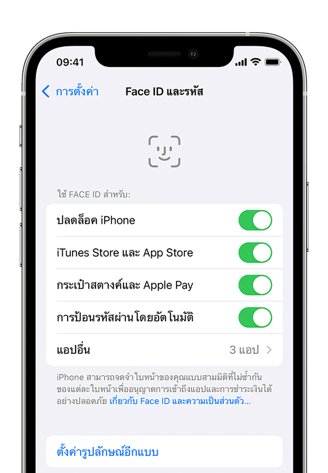2.เข้าไปที่การตั้งค่า > เฟสไอดีและรหัสผ่าน>เลือกหัวข้อ ปลดล๊อคไอโฟน เป็น (เปิด)เพราะบางที่ในส่วนนี้ปิดเอาไว้ทำให้เราไม่สามารถปลดล๊อคไอโฟนด้วยใบหน้าได้เลยอนุมานว่าไอโฟนเฟสไอดีเสียซะงั้น